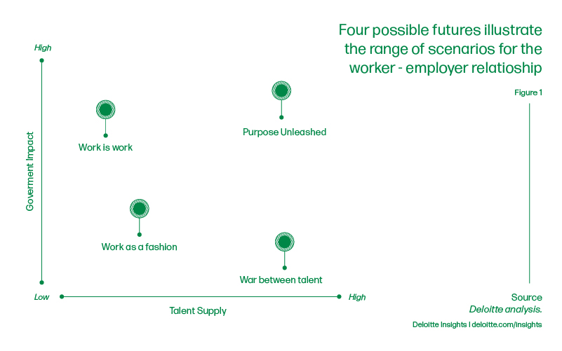 Purpose unleashed. In this scenario, the purpose is the dominant force driving the relationship between workers and employers. The employee and the employer see shared purpose as the relationship of their relationship. High government impact and high talent supply will lead to this scenario becoming reality. Their relationship is communal (Deloitte).